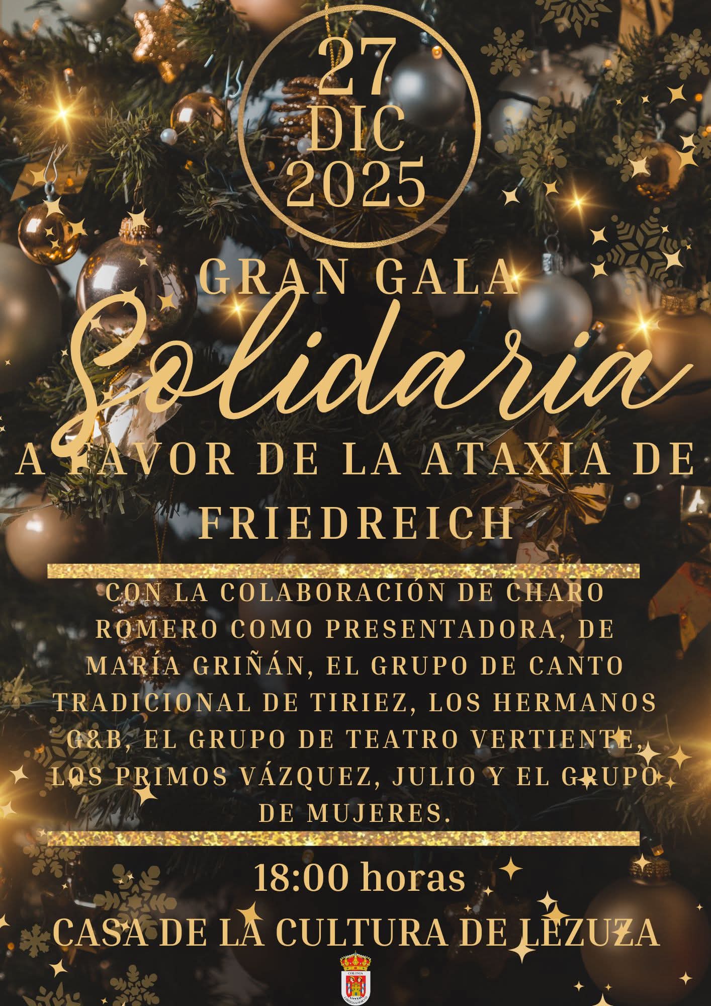 El próximo sábado 27 de diciembre, se celebrará en Lezuza (Albacete) la Gran Gala Solidaria organizada por su Ayuntamiento. Este año ha decidido destinar todo lo recaudado a un proyecto de investigación para encontrar la cura de la Ataxia de Friedreich (proyecto elegido por ASVAH). Esta colaboración ha sido posible gracias a Sergio Requena, afectado por la enfermedad.